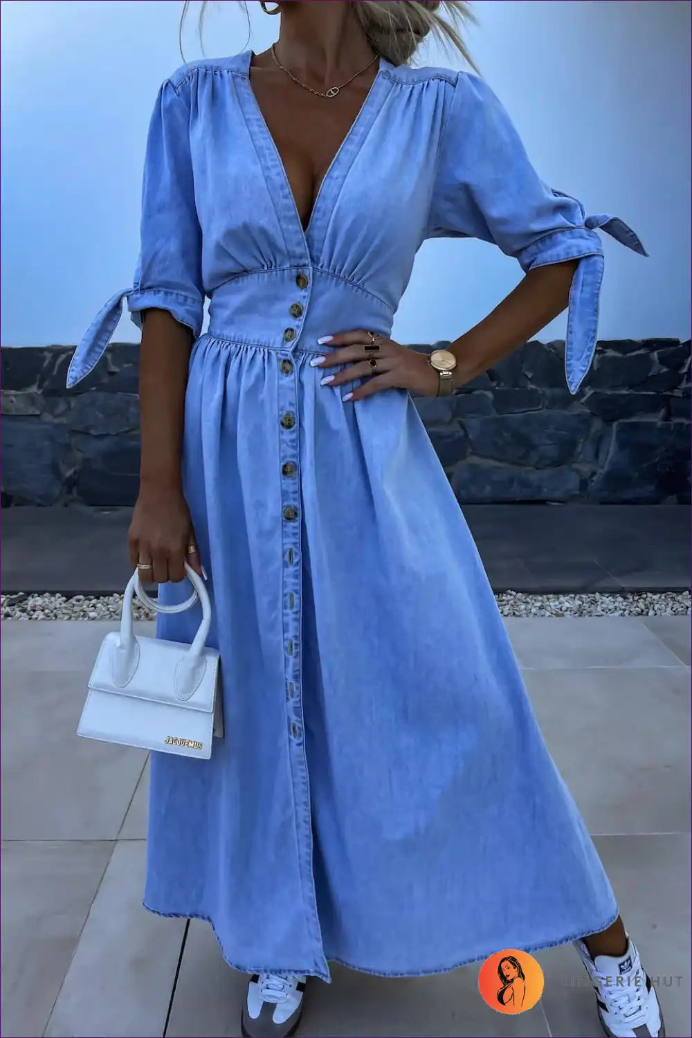 Elevate your summer wardrobe with our Elegant Split Denim Maxi Dress, designed for the modern woman who values both style and comfort. This stunning dress features a solid denim fabric with tie, split, and button elements, offering a flattering fit and unique charm. The V-neckline and 1/2 sleeves add a touch of sophistication, making it perfect for daily wear. Whether you're heading to work or enjoying a leisurely weekend, this denim maxi dress is your go-to for effortless elegance. 👗✨